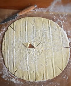 Etalez une feuille de papier sulfurisé et saupoudrez-la de farine. Sortez votre pâte du frigo et étalez-la dessus. Entaillez la pâte au niveau du centre sur 6 cm environ ( 4 entailles comme si vous dessiniez une étoile ). Faites la même chose sur 6 cm des bords extérieurs.